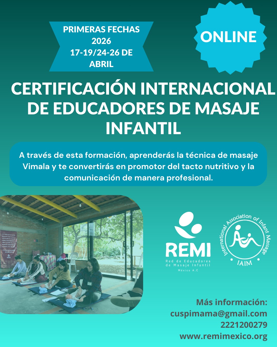REMI ofrece la certificación internacional de masaje infantil respaldada por la IAIM, en donde podrán formarse como educadores las personas interesadas en difundir y compartir la técnica de Vimala McClure, quienes a su vez ofrecerán cursos para padres e hijos en diferentes contextos a lo largo del país.